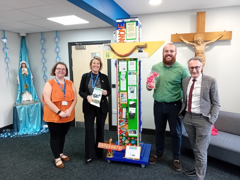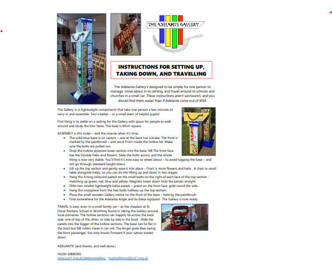 Made with secondary schools, churches and other communities in mind, The Adelante Gallery has visited many since 2018 - in Wokingham, Bracknell, Ascot, Portsmouth, Waterlooville, Leigh Park, Maidenhead, Windsor and Reading. In October 2024 Adelante arrived at its long-promised permanent home with the Romero Catholic Academy in Coventry - with its secondary and seven primary schools. The idea is that Adelante will in time visit each - and maybe find its way to others around.